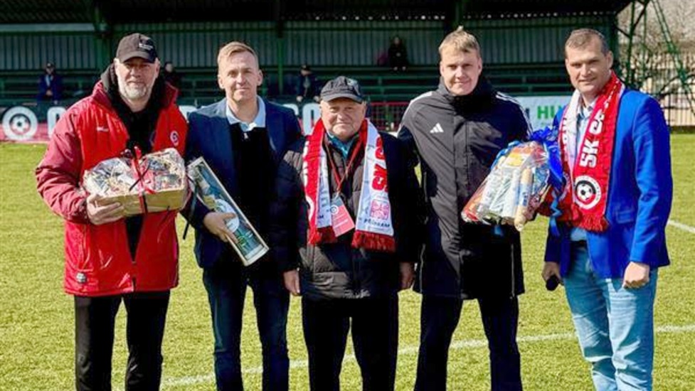Je velkou postavou fotbalu na Příbramsku, doslova legendou. A nyní legendou, která oslavila krásné kulaté životní jubileum. Josefu Mášovi (na snímku uprostřed) bylo minulý týden v úterý 70 roků a o víkendu za ním přijeli na jeho Spartak tohle jubileum oslavit i zástupci SKFS v čele s místopředsedou VV Petrem Blažejem.